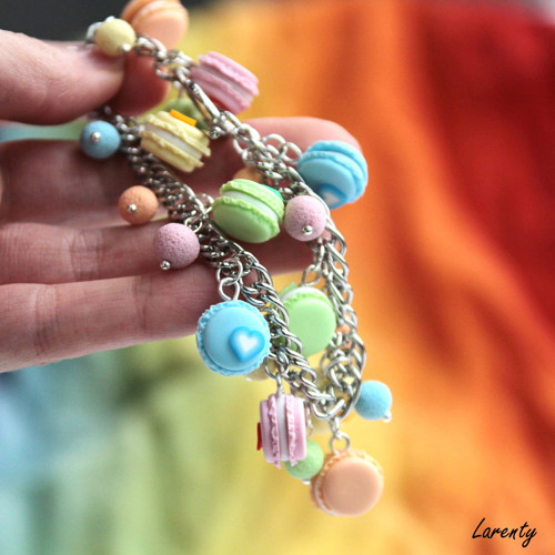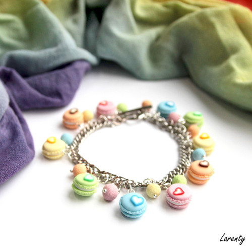 Světle pastelové makronky s vanilkovou náplní dozdobeny z jedné strany srdíčkem, doplněny o kuličky v barvě makronek.