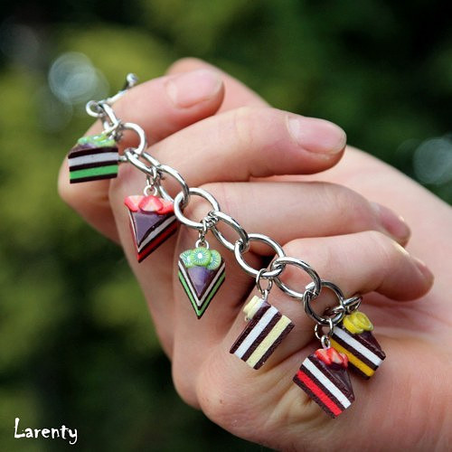 Náramek je složený z velkých kol a je ověšený barevnými ovocnými dorty - jahodový, kiwi, citron a banán.