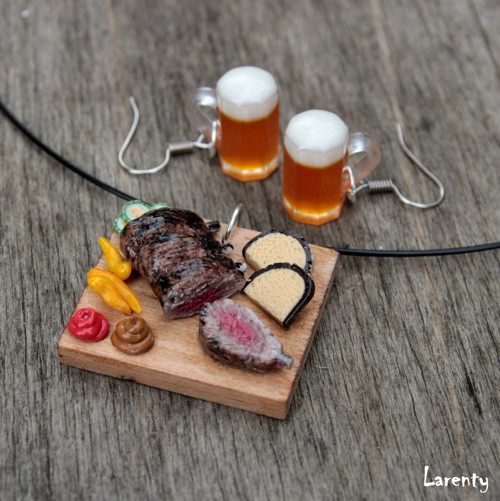 Setík představuje prkno s pečenými žebírky s kečupem, hořčicí a chlebem, doplněny o kozí rohy a několik plátků okurky. A ještě na zapití naušničky pivíčka... Velikost podnosu cca 3x2 cm