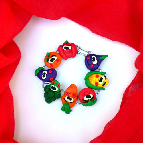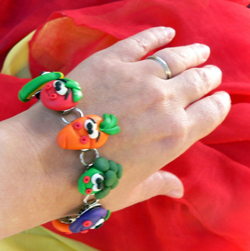 Náramek je tvořen zeleninou vyrobenou z FIMA v pestrých barvách. Lze vidět fialovou cibuli, kukuřici, rajče, mrkev, brokolici, lilek, dýni a papriku.